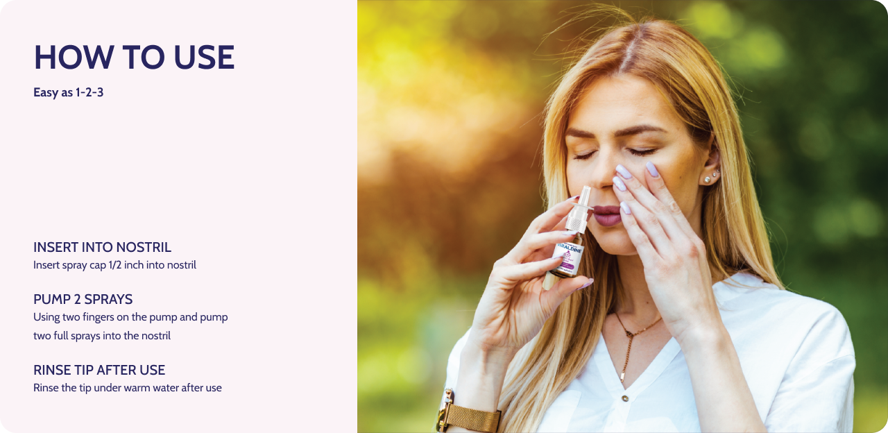 We suggest placing head slightly forward after nasal application to allow the solution to reach more areas and not drain back out of the nose. Look left for 15 seconds, then look right for 15 seconds, then tilt head back allowing the rest to reach behind nasal passages by adenoids area.
